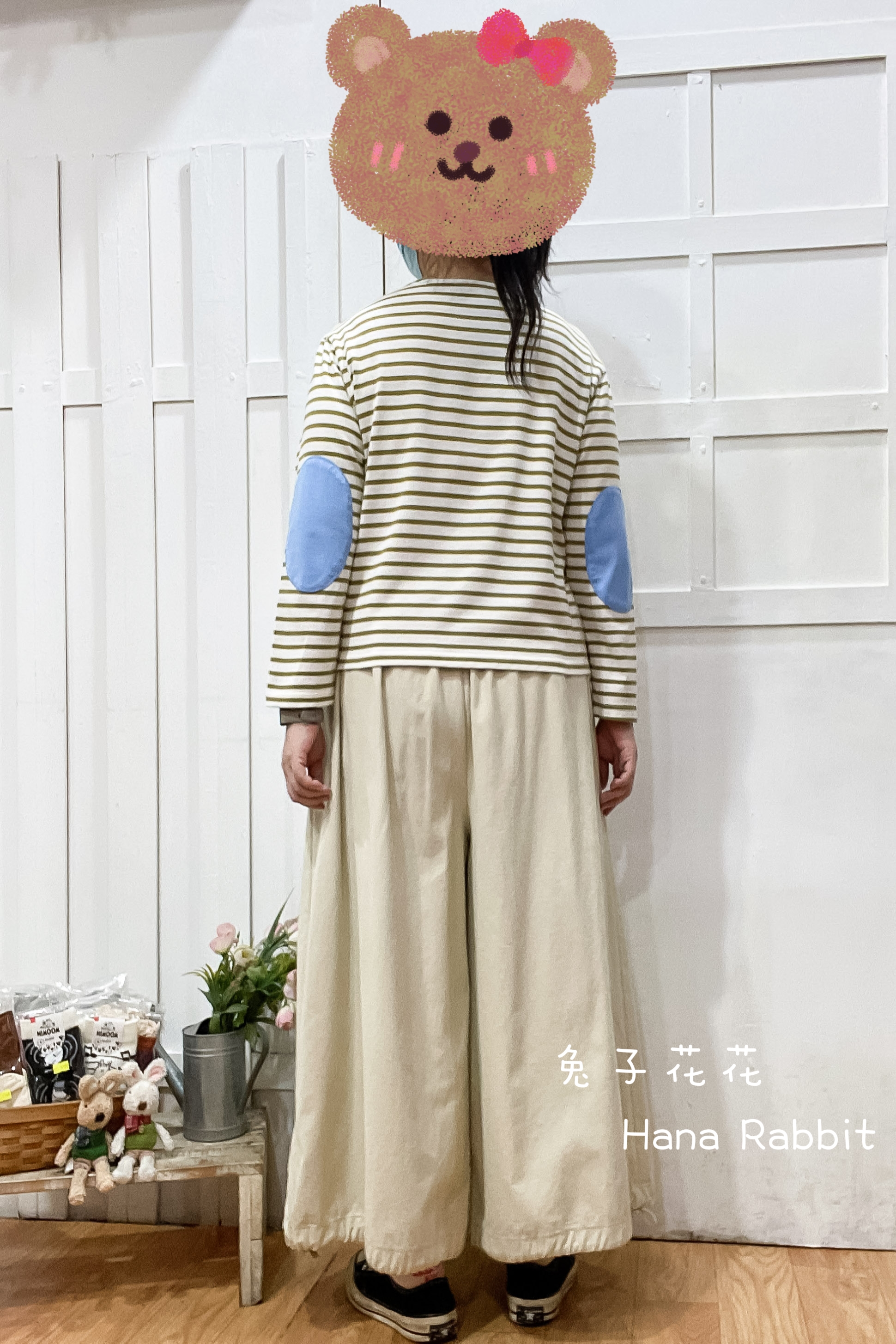 日系一字領條紋補丁棉質上衣(綠條) 13360
