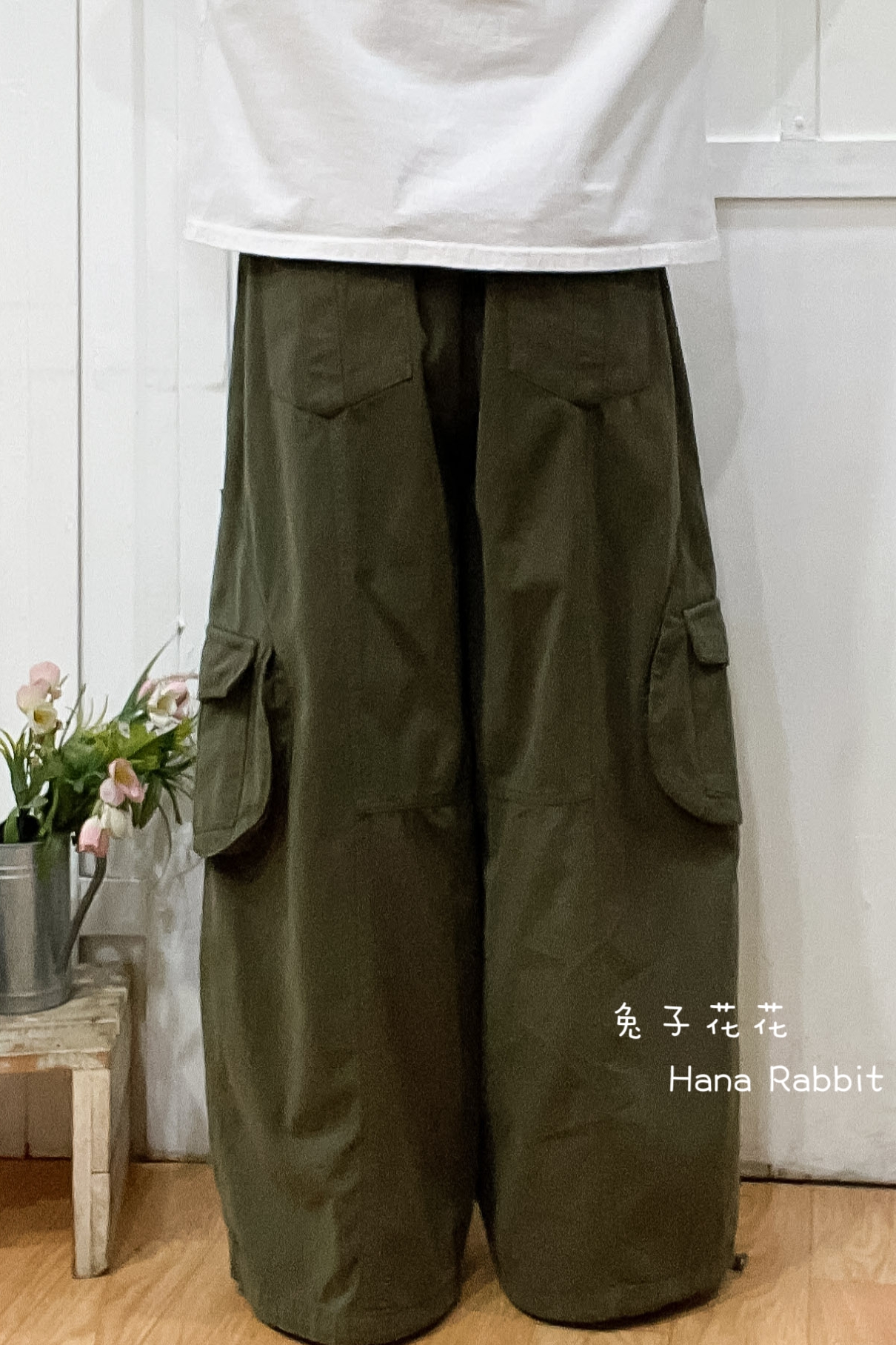 日系可縮腳內磨毛落地工裝造型褲(綠) 16969