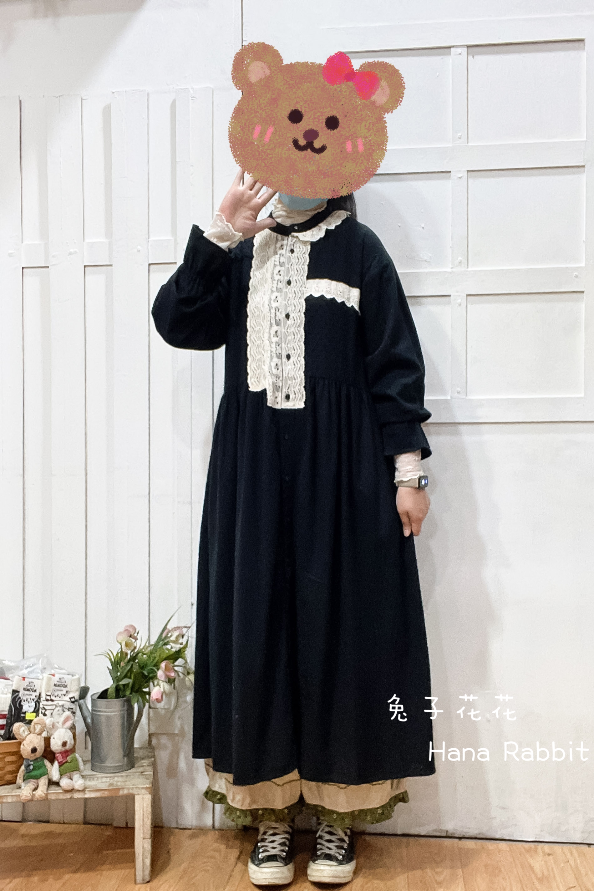 森系原單拚接蕾絲開襟洋裝(黑) 19423
