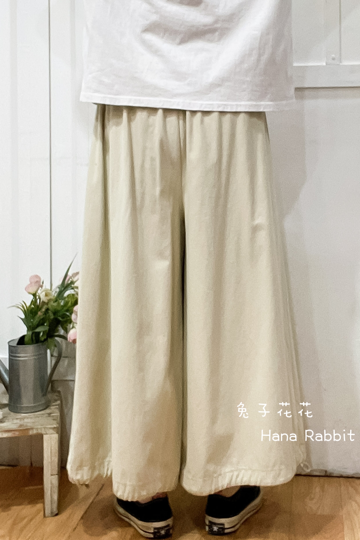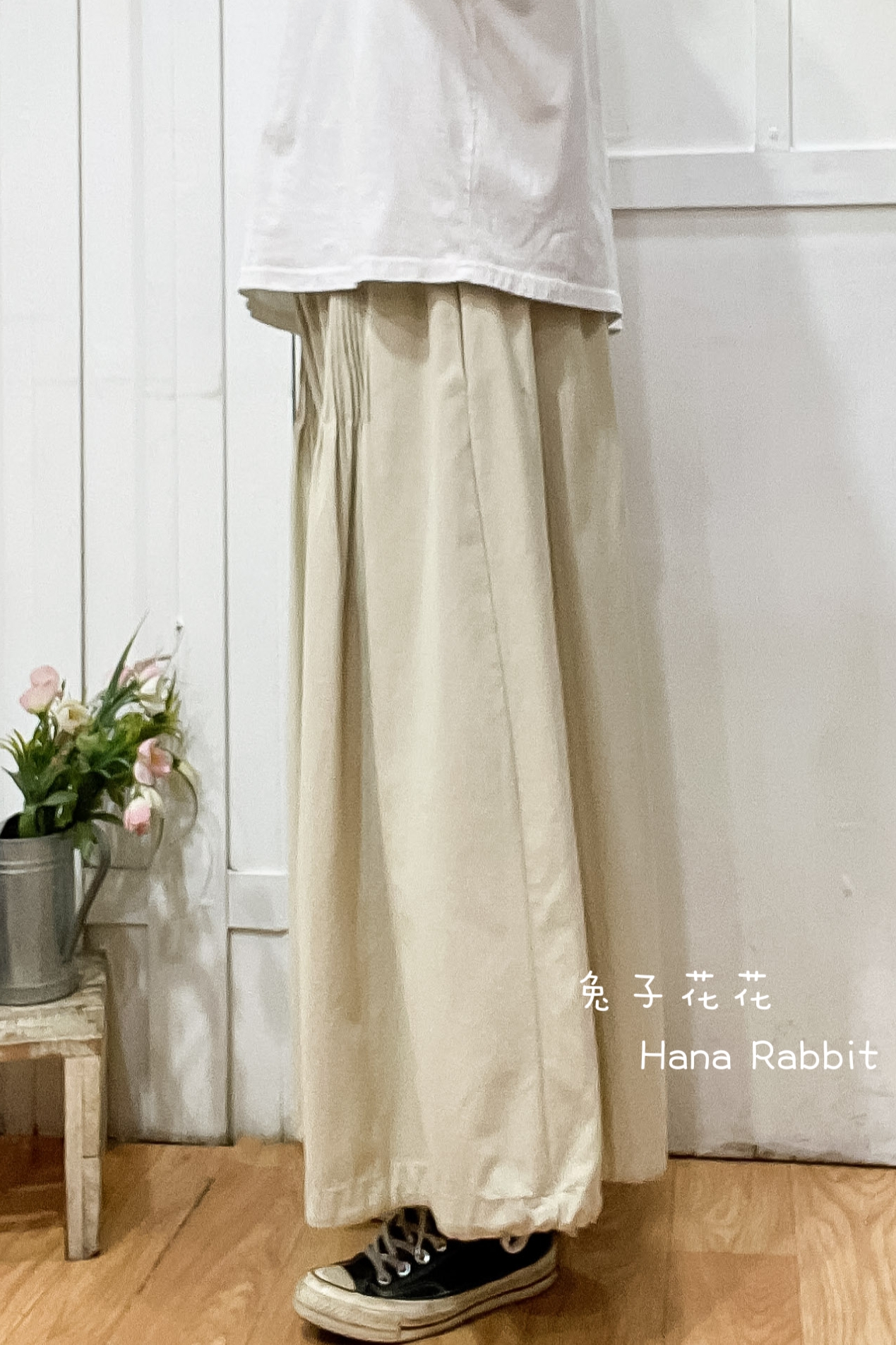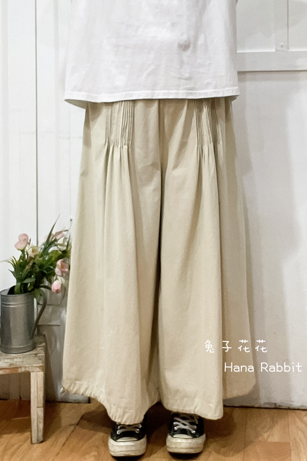 森系壓摺可縮腳闊腿寛褲裙(杏) 31101