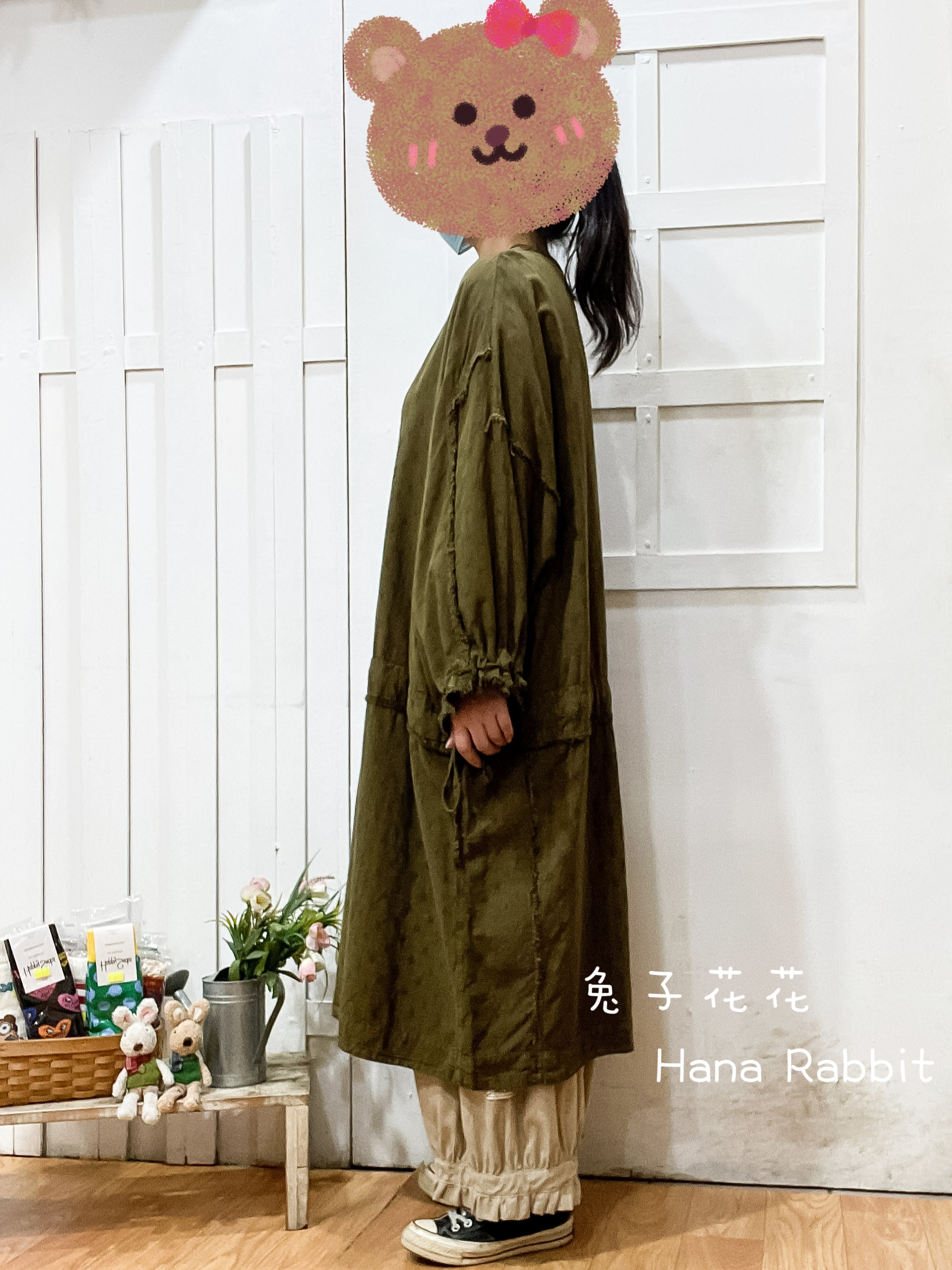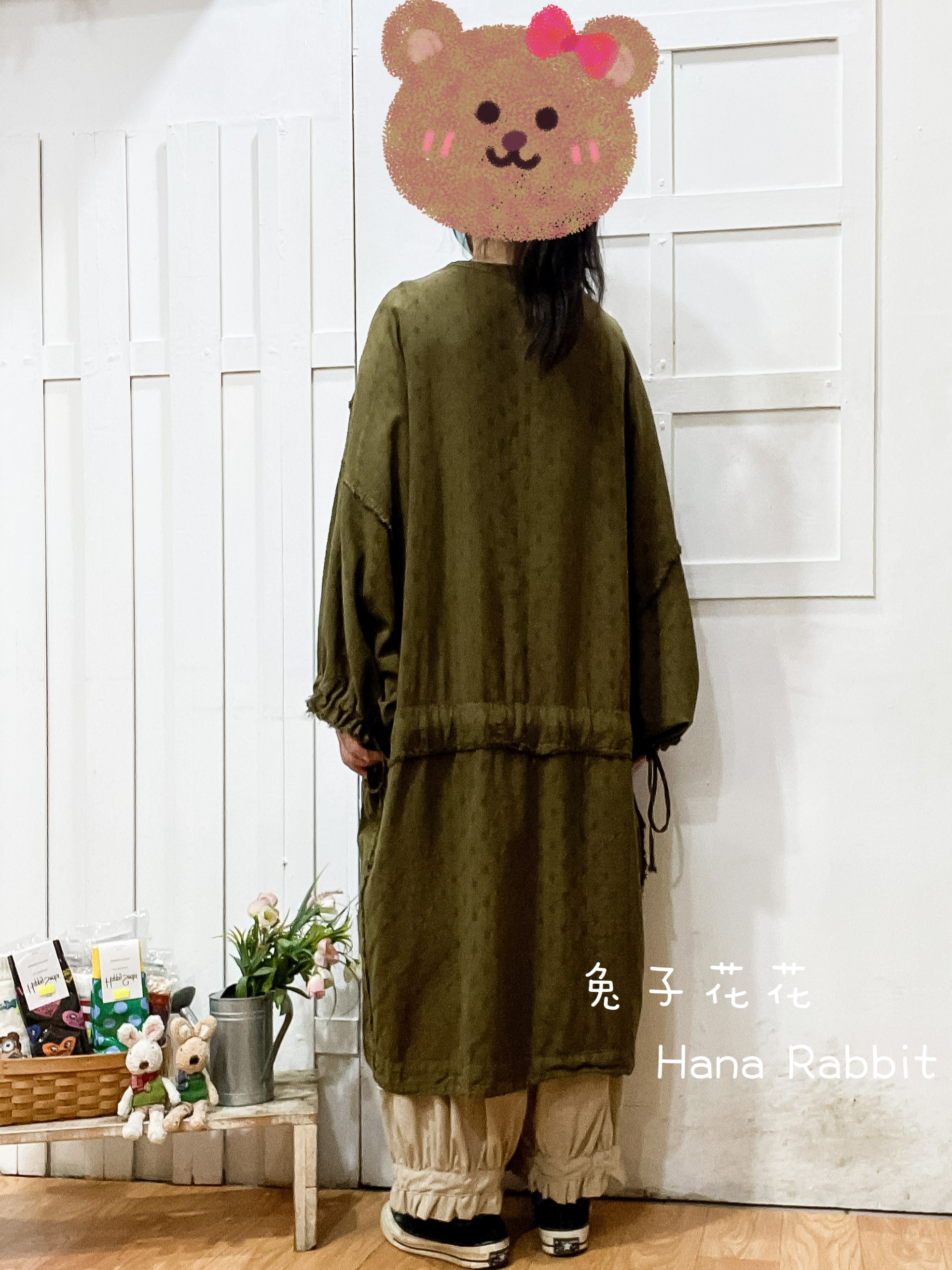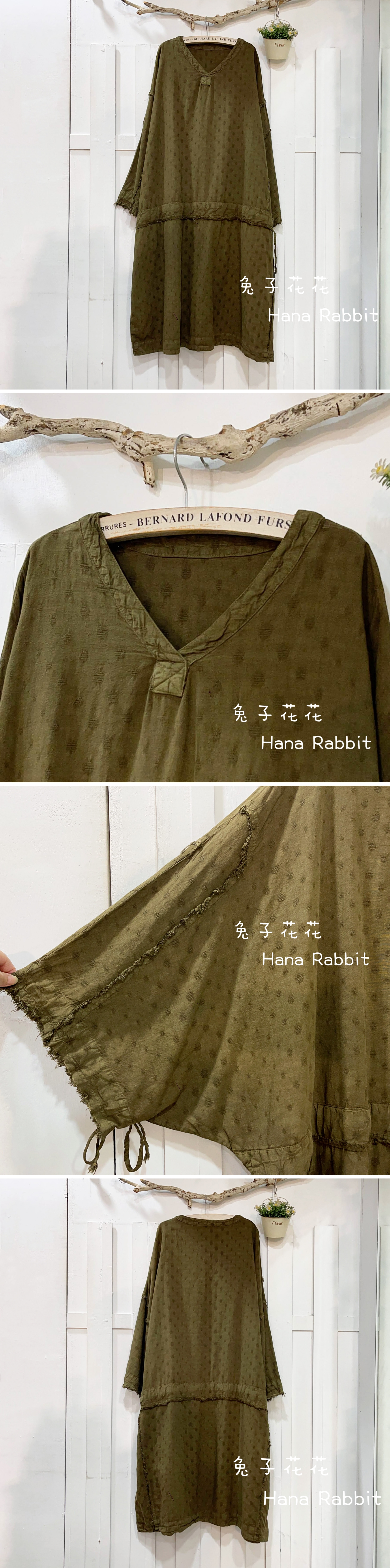 森系V領抽繩蝙蝠袖個性洋裝(咖綠) 30429