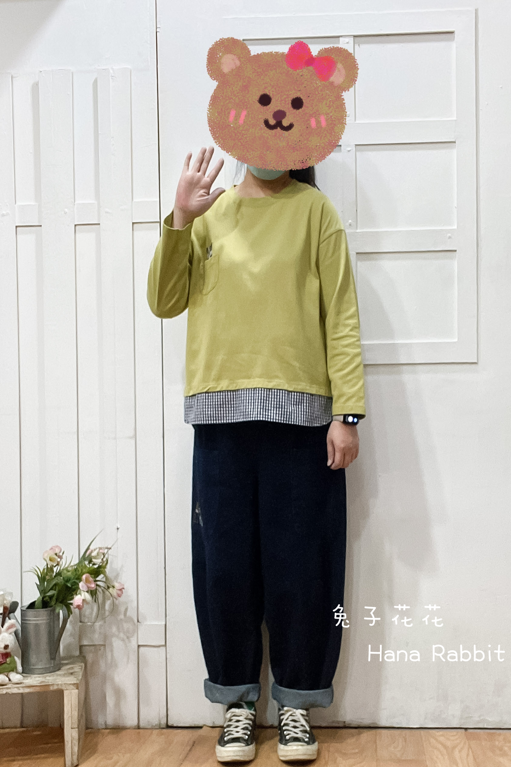 貓咪小口袋拚接格紋棉質上衣(芥黃) 19404