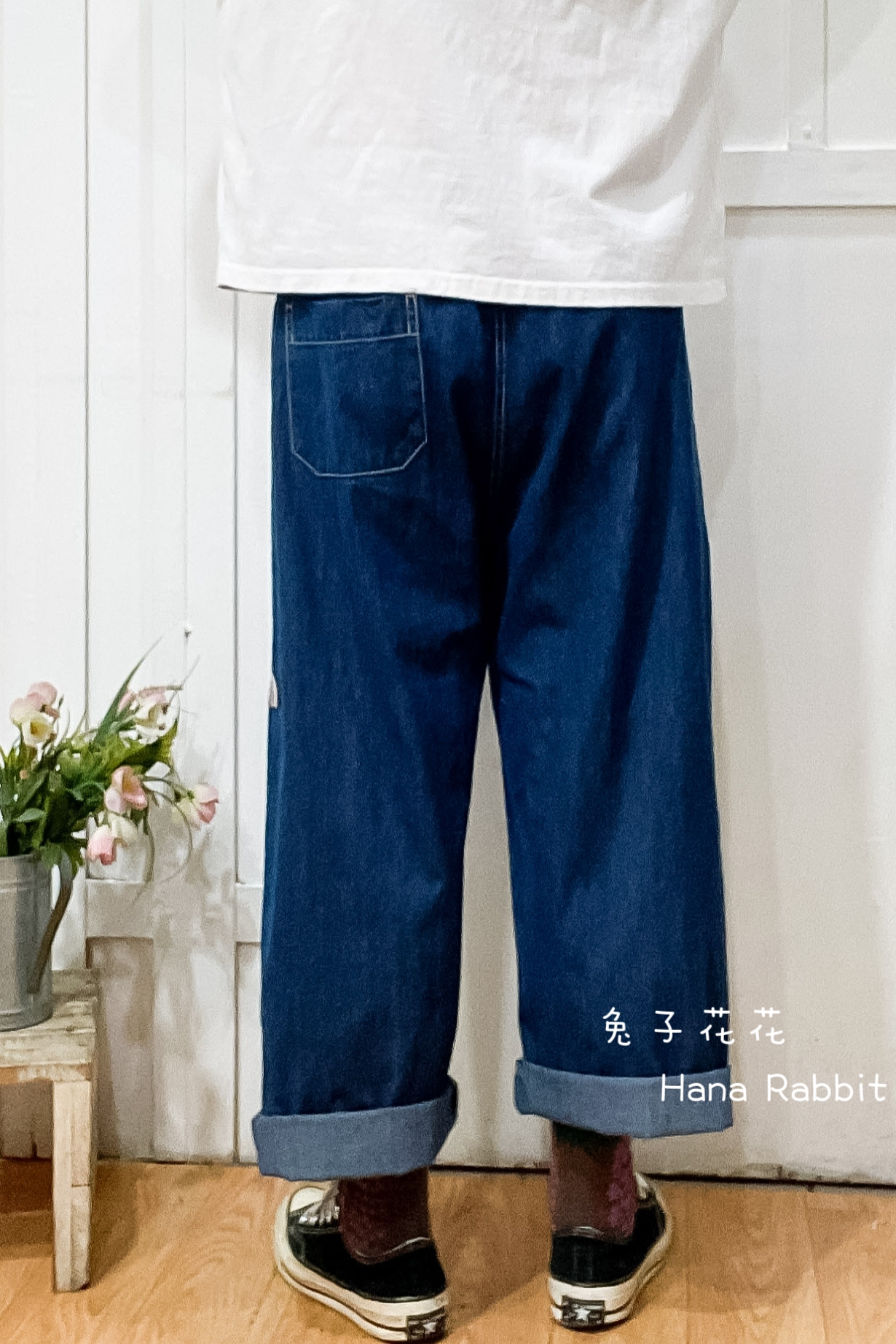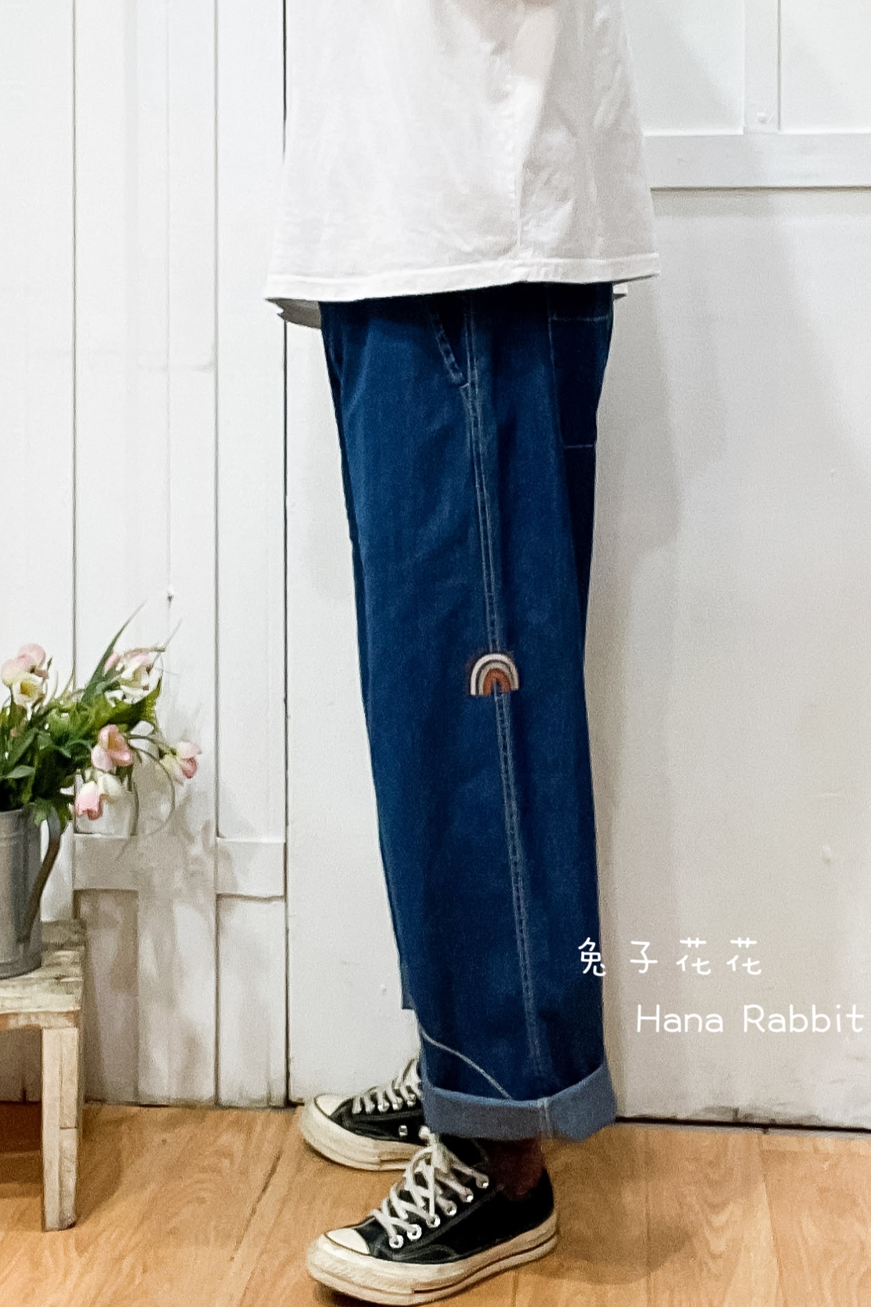 日系刺繡花闊腿丹寧造型褲 13837