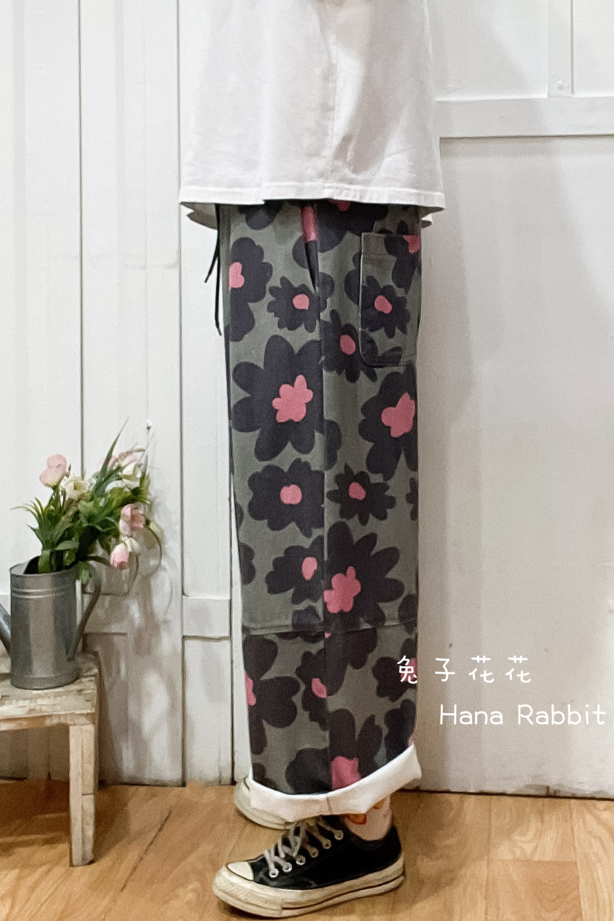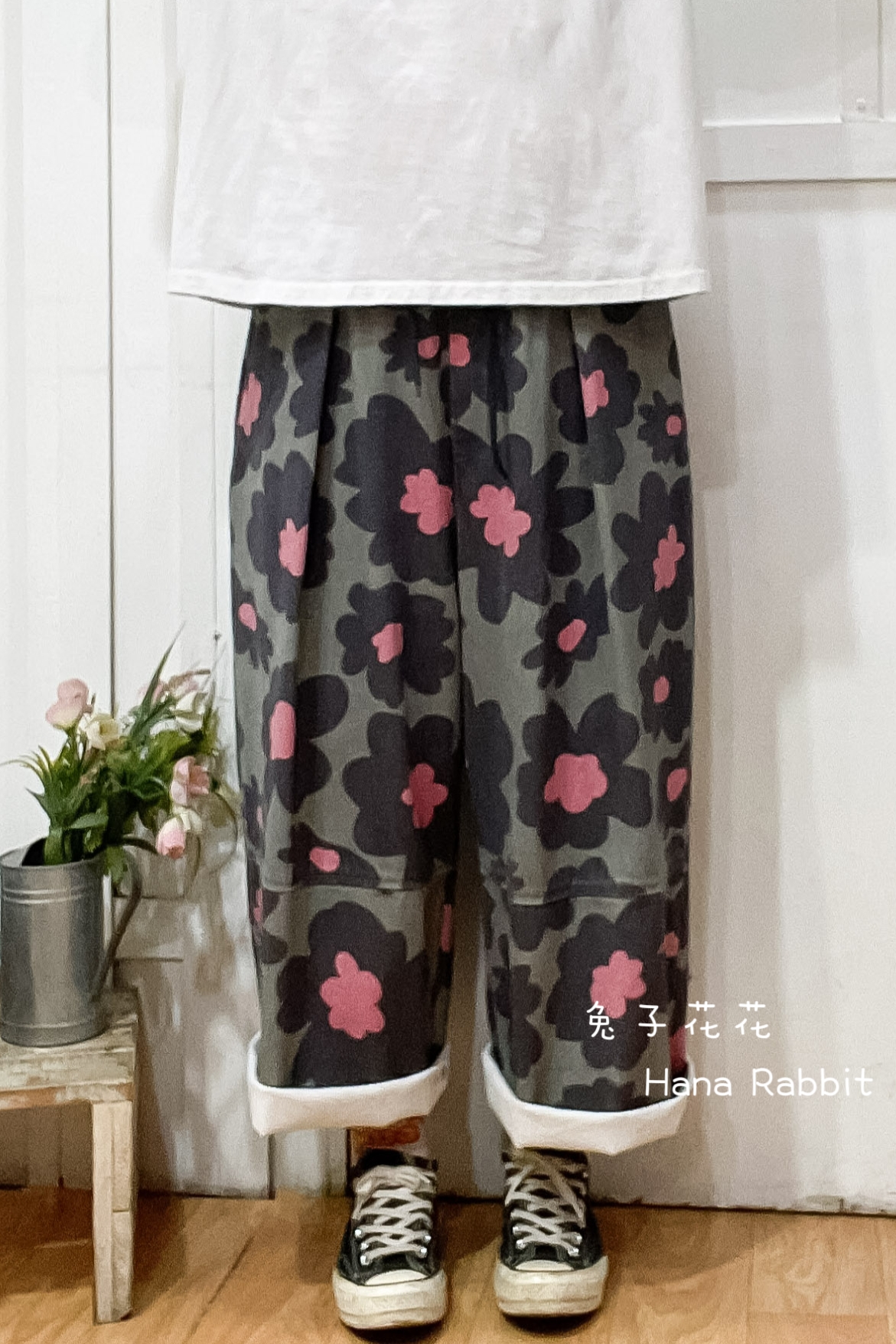 WE家水洗大花朵九分造型褲(灰) 17706